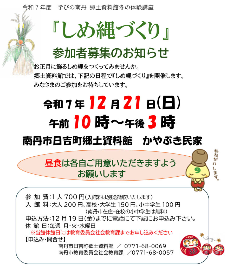 しめ縄づくり 2025年12月2日 最終更新日時 : 2025年12月2日 hiyoshi 令和7年度 学びの南丹 郷土資料館冬の体験講座 【会期】令和7年12月21日(日) 【開館時間】10:00〜15:00 【場所】南丹市日吉町郷土資料館 かやぶき民家